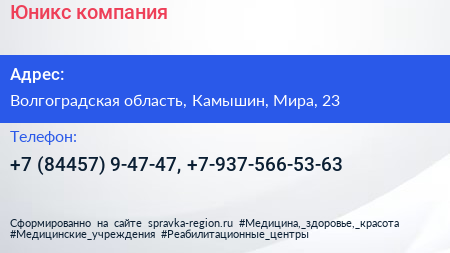Юникс, компания по адресу Волгоградская область, Камышин, Мира, 23 в дальнейшем Организация, размещена в следующих категориях: