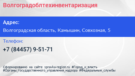 Волгоградоблтехинвентаризация по адресу Волгоградская область, Камышин, Совхозная, 5 в дальнейшем Организация, размещена в следующих категориях: