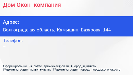 Дом Окон+, компания по адресу Волгоградская область, Камышин, Базарова, 144 в дальнейшем Организация, размещена в следующих категориях: