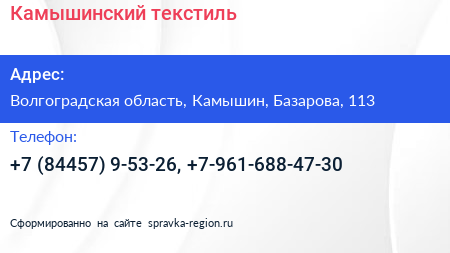 Камышинский текстиль по адресу Волгоградская область, Камышин, Базарова, 113 в дальнейшем Организация, размещена в следующих категориях: