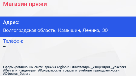 Магазин пряжи по адресу Волгоградская область, Камышин, Ленина, 30 в дальнейшем Организация, размещена в следующих категориях: