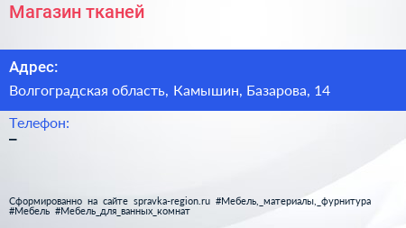 Магазин тканей по адресу Волгоградская область, Камышин, Базарова, 14 в дальнейшем Организация, размещена в следующих категориях: