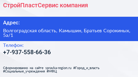 СтройПластСервис, компания по адресу Волгоградская область, Камышин, Братьев Сорокиных, 5а/1 в дальнейшем Организация, размещена в следующих категориях: