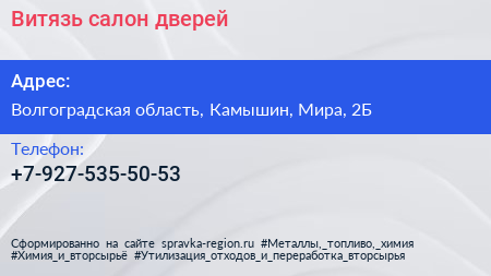 Витязь, салон дверей по адресу Волгоградская область, Камышин, Мира, 2Б в дальнейшем Организация, размещена в следующих категориях: