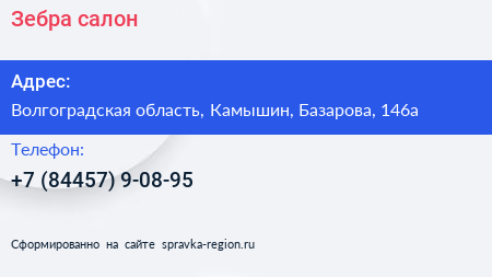 Зебра, салон по адресу Волгоградская область, Камышин, Базарова, 146а в дальнейшем Организация, размещена в следующих категориях: