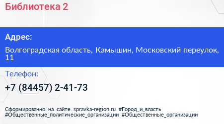 Библиотека №2 по адресу Волгоградская область, Камышин, Московский переулок, 11 в дальнейшем Организация, размещена в следующих категориях: