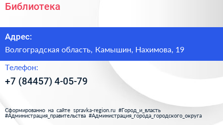 Библиотека по адресу Волгоградская область, Камышин, Нахимова, 19 в дальнейшем Организация, размещена в следующих категориях: