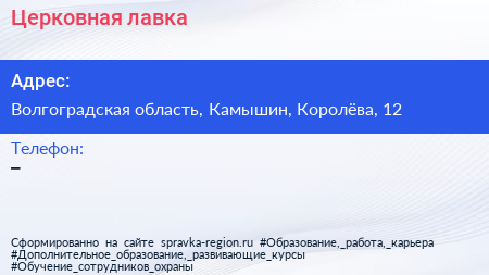 Церковная лавка по адресу Волгоградская область, Камышин, Королёва, 12 в дальнейшем Организация, размещена в следующих категориях: