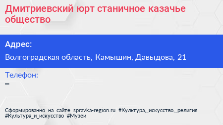 Дмитриевский юрт, станичное казачье общество по адресу Волгоградская область, Камышин, Давыдова, 21 в дальнейшем Организация, размещена в следующих категориях: