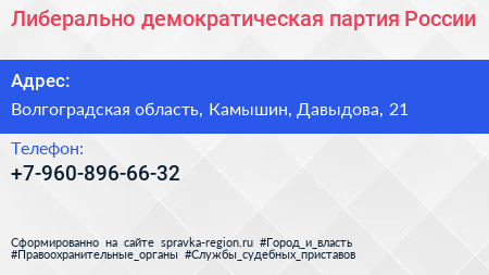 Либерально-демократическая партия России по адресу Волгоградская область, Камышин, Давыдова, 21 в дальнейшем Организация, размещена в следующих категориях: