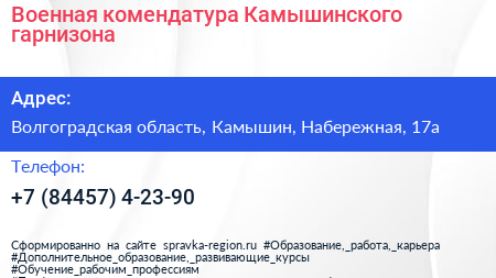 Военная комендатура Камышинского гарнизона по адресу Волгоградская область, Камышин, Набережная, 17а в дальнейшем Организация, размещена в следующих категориях:
