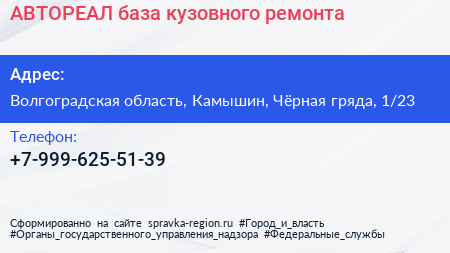 АВТОРЕАЛ, база кузовного ремонта по адресу Волгоградская область, Камышин, Чёрная гряда, 1/23 в дальнейшем Организация, размещена в следующих категориях:
