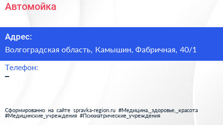 Автомойка по адресу Волгоградская область, Камышин, Фабричная, 40/1 в дальнейшем Организация, размещена в следующих категориях:
