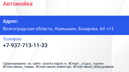 Автомойка по адресу Волгоградская область, Камышин, Базарова, 64 ст1 в дальнейшем Организация, размещена в следующих категориях: