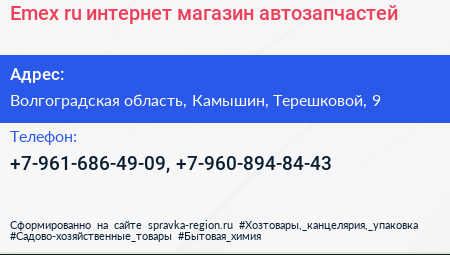 Emex.ru, интернет-магазин автозапчастей по адресу Волгоградская область, Камышин, Терешковой, 9 в дальнейшем Организация, размещена в следующих категориях: