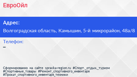 ЕвроОйл по адресу Волгоградская область, Камышин, 5-й микрорайон, 48а/8 в дальнейшем Организация, размещена в следующих категориях: