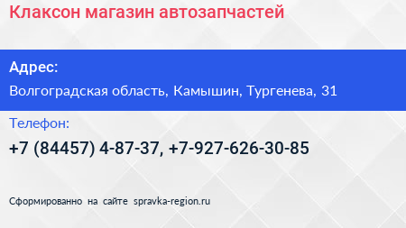 Клаксон, магазин автозапчастей по адресу Волгоградская область, Камышин, Тургенева, 31 в дальнейшем Организация, размещена в следующих категориях: