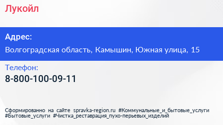 Лукойл по адресу Волгоградская область, Камышин, Южная улица, 15 в дальнейшем Организация, размещена в следующих категориях: