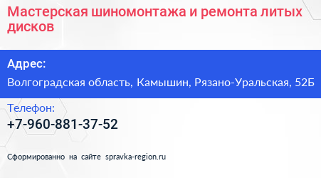 Мастерская шиномонтажа и ремонта литых дисков по адресу Волгоградская область, Камышин, Рязано-Уральская, 52Б в дальнейшем Организация, размещена в следующих категориях: