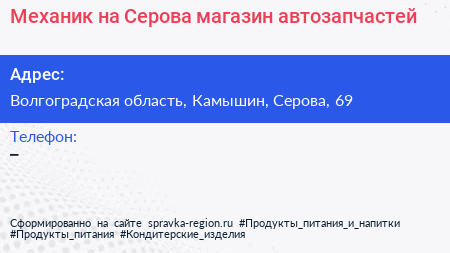 Механик на Серова, магазин автозапчастей по адресу Волгоградская область, Камышин, Серова, 69 в дальнейшем Организация, размещена в следующих категориях: