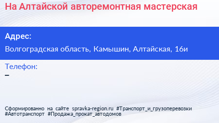 На Алтайской, авторемонтная мастерская по адресу Волгоградская область, Камышин, Алтайская, 16и в дальнейшем Организация, размещена в следующих категориях: