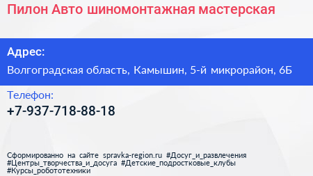 Пилон-Авто, шиномонтажная мастерская по адресу Волгоградская область, Камышин, 5-й микрорайон, 6Б в дальнейшем Организация, размещена в следующих категориях: