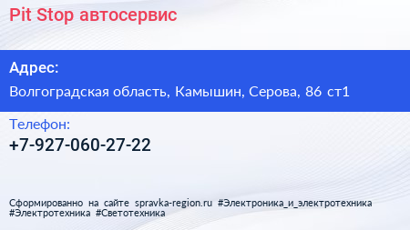Pit-Stop, автосервис по адресу Волгоградская область, Камышин, Серова, 86 ст1 в дальнейшем Организация, размещена в следующих категориях: