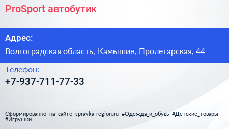 ProSport, автобутик по адресу Волгоградская область, Камышин, Пролетарская, 44 в дальнейшем Организация, размещена в следующих категориях: