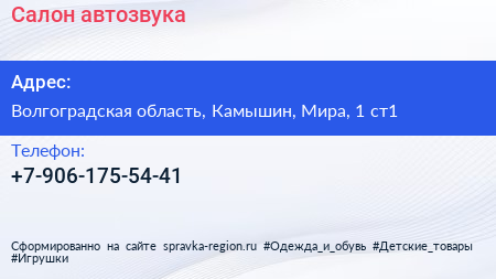 Салон автозвука по адресу Волгоградская область, Камышин, Мира, 1 ст1 в дальнейшем Организация, размещена в следующих категориях: