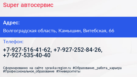 Super, автосервис по адресу Волгоградская область, Камышин, Витебская, 66 в дальнейшем Организация, размещена в следующих категориях: