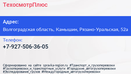 ТехосмотрПлюс по адресу Волгоградская область, Камышин, Рязано-Уральская, 52а в дальнейшем Организация, размещена в следующих категориях: