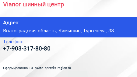 Vianor, шинный центр по адресу Волгоградская область, Камышин, Тургенева, 33 в дальнейшем Организация, размещена в следующих категориях: