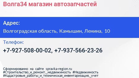 Волга34, магазин автозапчастей по адресу Волгоградская область, Камышин, Ленина, 10 в дальнейшем Организация, размещена в следующих категориях: