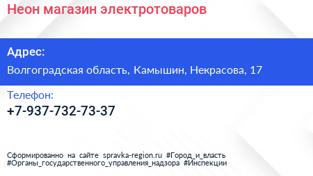 Неон, магазин электротоваров по адресу Волгоградская область, Камышин, Некрасова, 17 в дальнейшем Организация, размещена в следующих категориях: