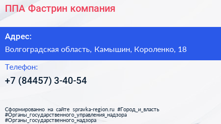 ППА-Фастрин, компания по адресу Волгоградская область, Камышин, Короленко, 18 в дальнейшем Организация, размещена в следующих категориях: