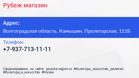 Рубеж, магазин по адресу Волгоградская область, Камышин, Пролетарская, 111Б в дальнейшем Организация, размещена в следующих категориях: