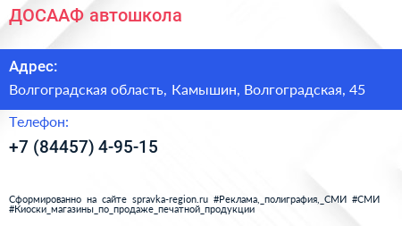 ДОСААФ, автошкола по адресу Волгоградская область, Камышин, Волгоградская, 45 в дальнейшем Организация, размещена в следующих категориях: