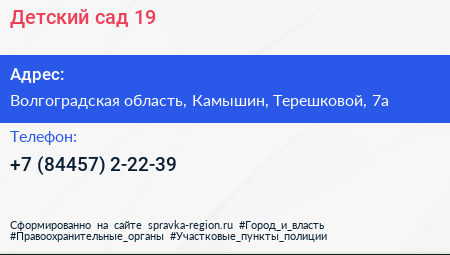 Детский сад №19 по адресу Волгоградская область, Камышин, Терешковой, 7а в дальнейшем Организация, размещена в следующих категориях: