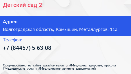 Детский сад №2 по адресу Волгоградская область, Камышин, Металлургов, 11а в дальнейшем Организация, размещена в следующих категориях: