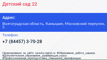 Детский сад №22 по адресу Волгоградская область, Камышин, Московский переулок, 5 в дальнейшем Организация, размещена в следующих категориях: