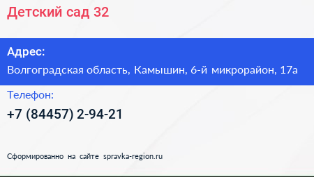 Детский сад №32 по адресу Волгоградская область, Камышин, 6-й микрорайон, 17а в дальнейшем Организация, размещена в следующих категориях: