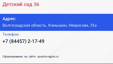 Детский сад №36 по адресу Волгоградская область, Камышин, Некрасова, 31а в дальнейшем Организация, размещена в следующих категориях: