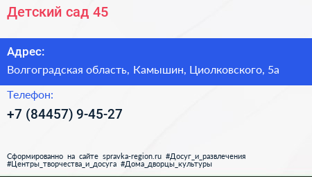 Детский сад №45 по адресу Волгоградская область, Камышин, Циолковского, 5а в дальнейшем Организация, размещена в следующих категориях: