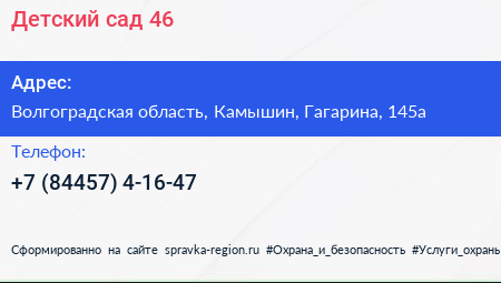 Детский сад №46 по адресу Волгоградская область, Камышин, Гагарина, 145а в дальнейшем Организация, размещена в следующих категориях: