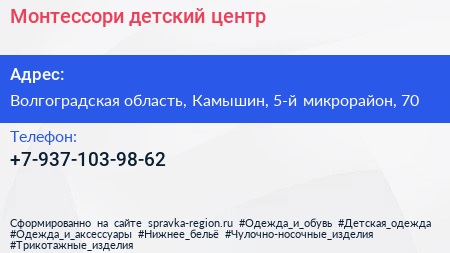 Монтессори, детский центр по адресу Волгоградская область, Камышин, 5-й микрорайон, 70 в дальнейшем Организация, размещена в следующих категориях: