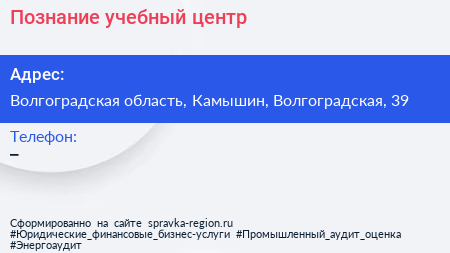 Познание, учебный центр по адресу Волгоградская область, Камышин, Волгоградская, 39 в дальнейшем Организация, размещена в следующих категориях: