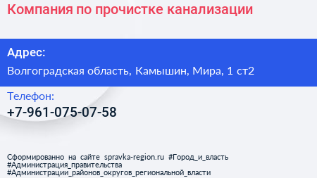 Компания по прочистке канализации по адресу Волгоградская область, Камышин, Мира, 1 ст2 в дальнейшем Организация, размещена в следующих категориях: