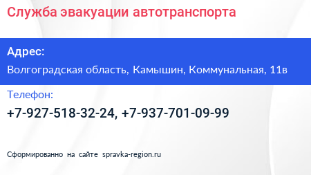 Служба эвакуации автотранспорта по адресу Волгоградская область, Камышин, Коммунальная, 11в в дальнейшем Организация, размещена в следующих категориях: