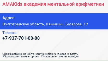 AMAKids, академия ментальной арифметики по адресу Волгоградская область, Камышин, Базарова, 19 в дальнейшем Организация, размещена в следующих категориях: