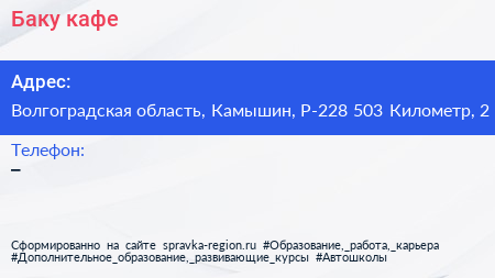 Баку, кафе по адресу Волгоградская область, Камышин, Р-228 503 Километр, 2 в дальнейшем Организация, размещена в следующих категориях: